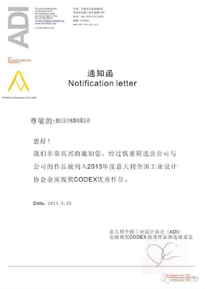 不無(wú)巧合,玉立創(chuàng)始于1954年與ADI金圓規(guī)獎(jiǎng)項(xiàng)1954創(chuàng)立同一年而生,玉立電器正是憑借60年的歷史和精湛的工業(yè)制造技術(shù)榮獲意大利全國(guó)工業(yè)設(shè)計(jì)協(xié)會(huì)金圓規(guī)獎(jiǎng)CODEX優(yōu)秀作品大獎(jiǎng)。