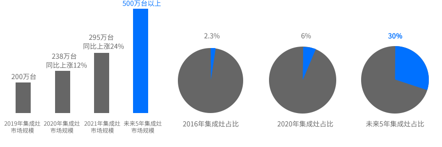 根據(jù)GfK中怡康數(shù)據(jù)顯示,集成灶在2017年銷(xiāo)量突破百萬(wàn)臺(tái),在2018年銷(xiāo)額突破百億元,而在2019年銷(xiāo)量就突破200萬(wàn)臺(tái),2020年規(guī)模接近200億元,成長(zhǎng)非常快!以煙灶消銷(xiāo)量為參照,2016年集成灶銷(xiāo)量占比僅為2.3%,到2020年這個(gè)比例已經(jīng)是6%,卻還沒(méi)突破10%,預(yù)計(jì)未來(lái)五年,集成灶銷(xiāo)量將會(huì)占到30%以上,僅從這個(gè)角度考慮,集成灶市場(chǎng)非常廣闊。